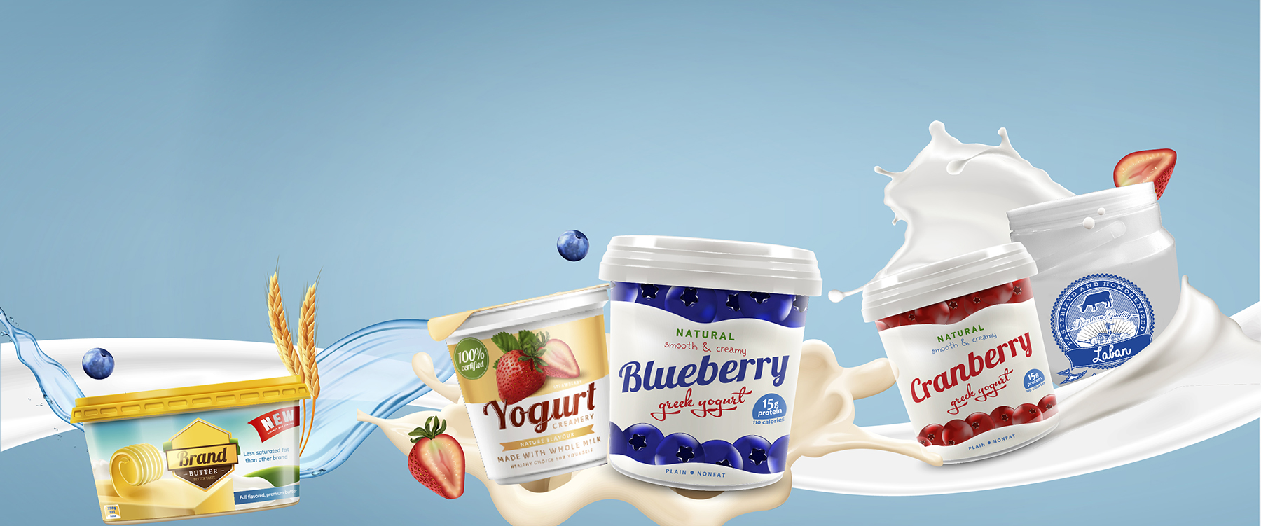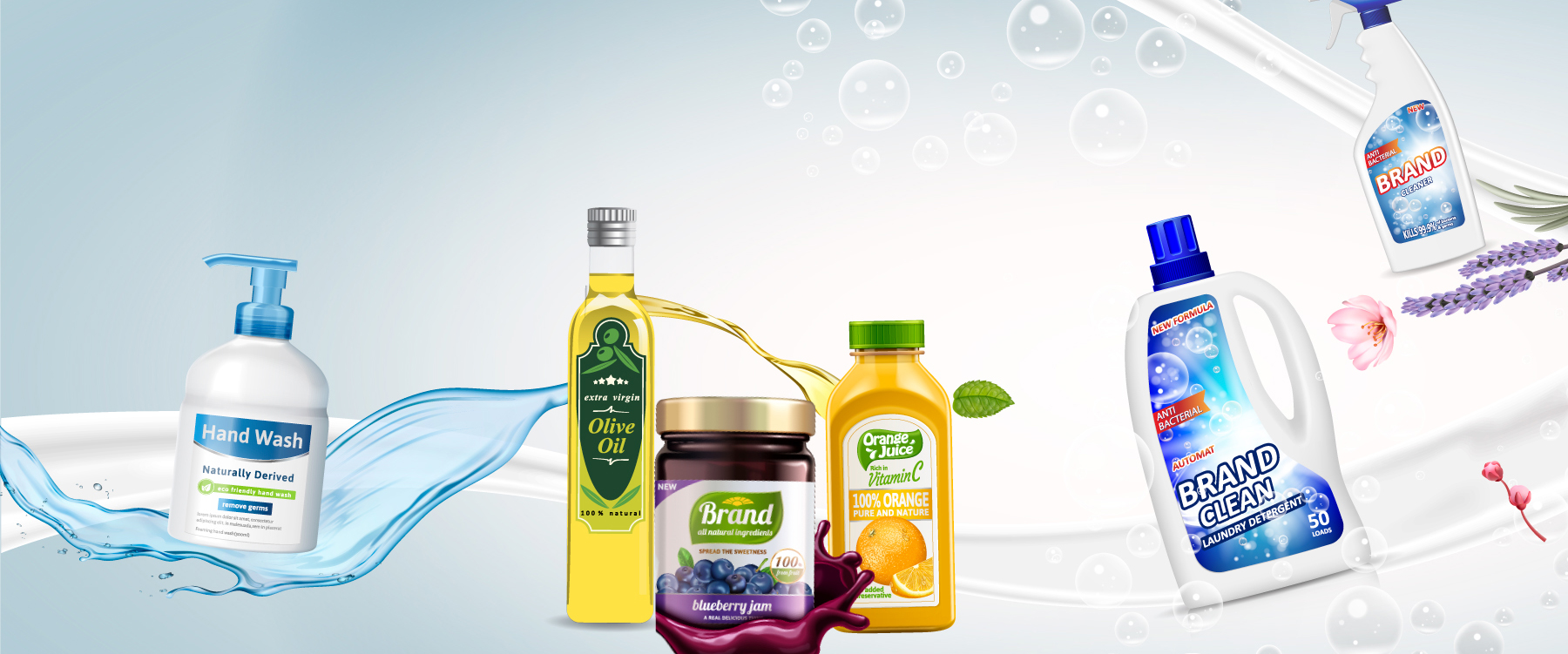 Branded food labels for bottles, cans, jars, tubs, ad containers of jam, honey, yogurt, milk, butter, olive oil, and more.